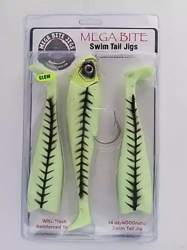 The Mega Bite swim tail jigs are deep drop swim tail jigs with amazing swimming action for all types of bottom fish. Tails are reinforced with mesh and are extremely durable. These are 14 ounce/ 400 gram jigs and come with 3 tails and 1 jig head.