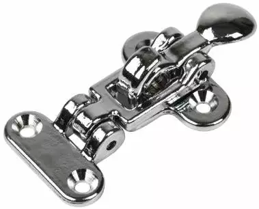 Anti-Rattle Latch features an open-mount, center-tensioning cam latch for a tight, no-rattle seal. Latch also features a locking hole that will accept a padlock with up to a 1/4″ diameter shank. Ideal for cabinets, doors, and hatches. Constructed of chrome plated sand cast brass. Surface mounts with four #10 FH fasteners (not included).