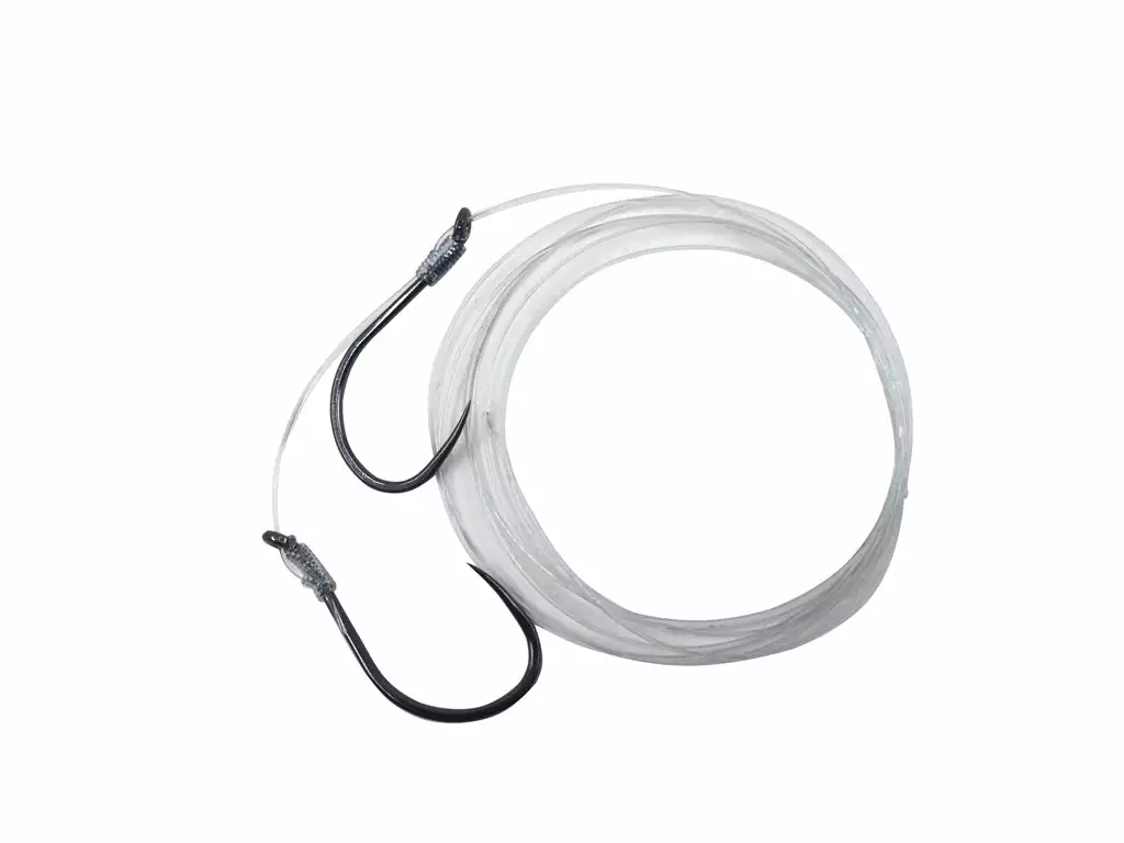 5/0 & 5/0 and 5/0 & 4/0 are barbless Beak Hooks. Main Line 8 feet Super Star 35 lbs test Mono. Trailer is 5.5″ eye to eye.                                                                                    80005040 is SKU number for 5/0 Main and 4/0 Trailer.                      80005050 is SKU number for 5/0 Main and 5/0 Trailer.